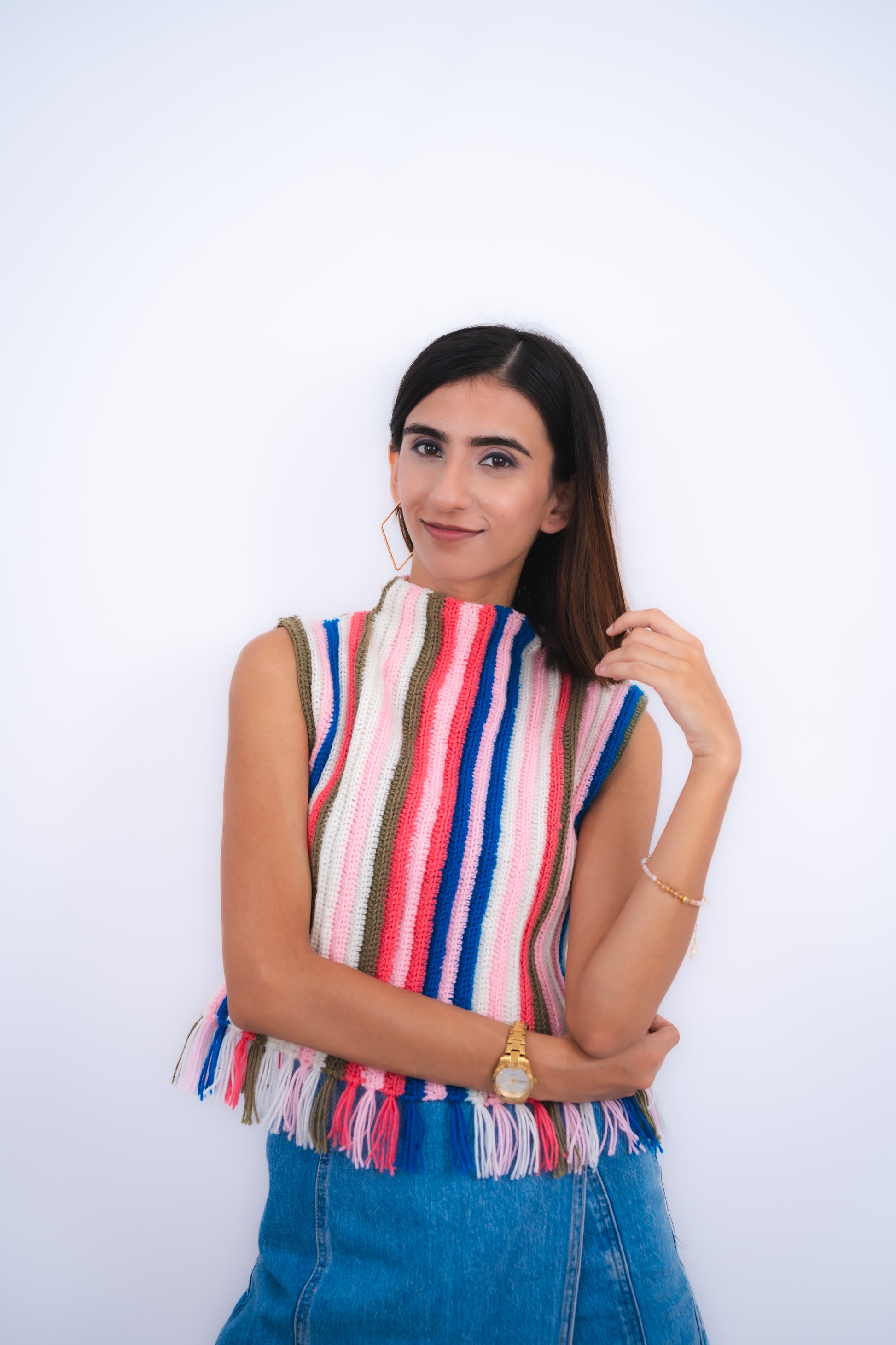 Add a pop of color to your wardrobe with our handcrafted sleeveless crochet vest featuring vibrant stripes and playful tassels. This eye-catching piece is designed to make a statement and elevate your style.