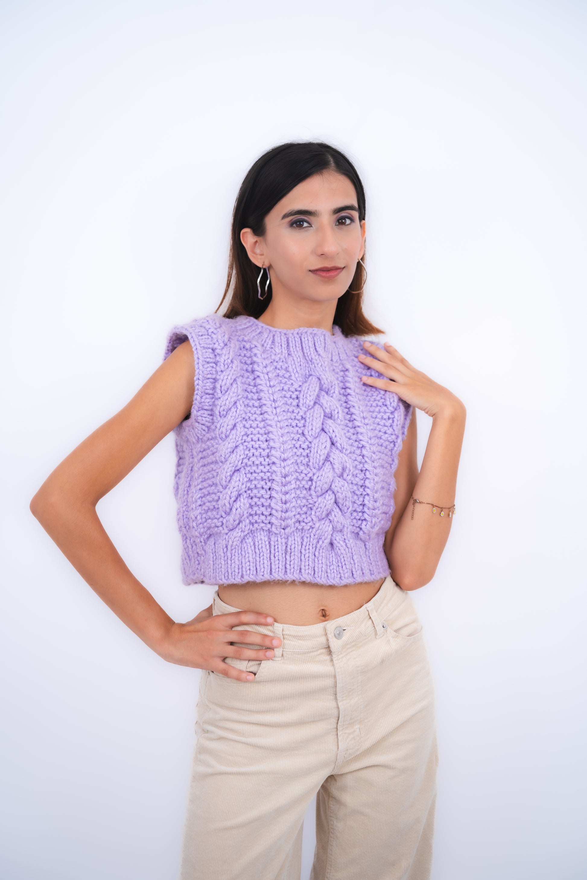 Indulge in the luxury of our handcrafted, chunky knit sweater vest. Inspired by the latest Pinterest trends, this stunning piece boasts intricate knit designs that exude a bohemian charm. The soft lavender shade adds a touch of elegance, making it a versatile addition to your wardrobe.