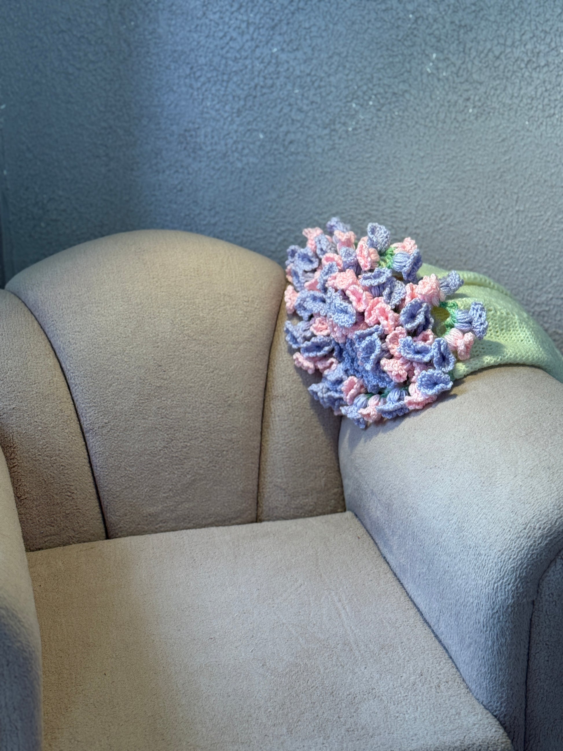 Indulge in the handcrafted beauty of this crochet viral bouquet blanket. Each stitch is lovingly created using high-quality 100% acrylic yarn, ensuring a soft and long-lasting finish. The captivating "viral" pattern forms the central focus, while a meticulously crocheted border of delicate roses adds a touch of timeless elegance. Measuring 35 inches in diameter, this blanket is a testament to the skill and artistry of crochet. Adding to its unique charm, this blanket can also be artfully folded to resemble a beautiful bouquet, making it a truly special and versatile piece.