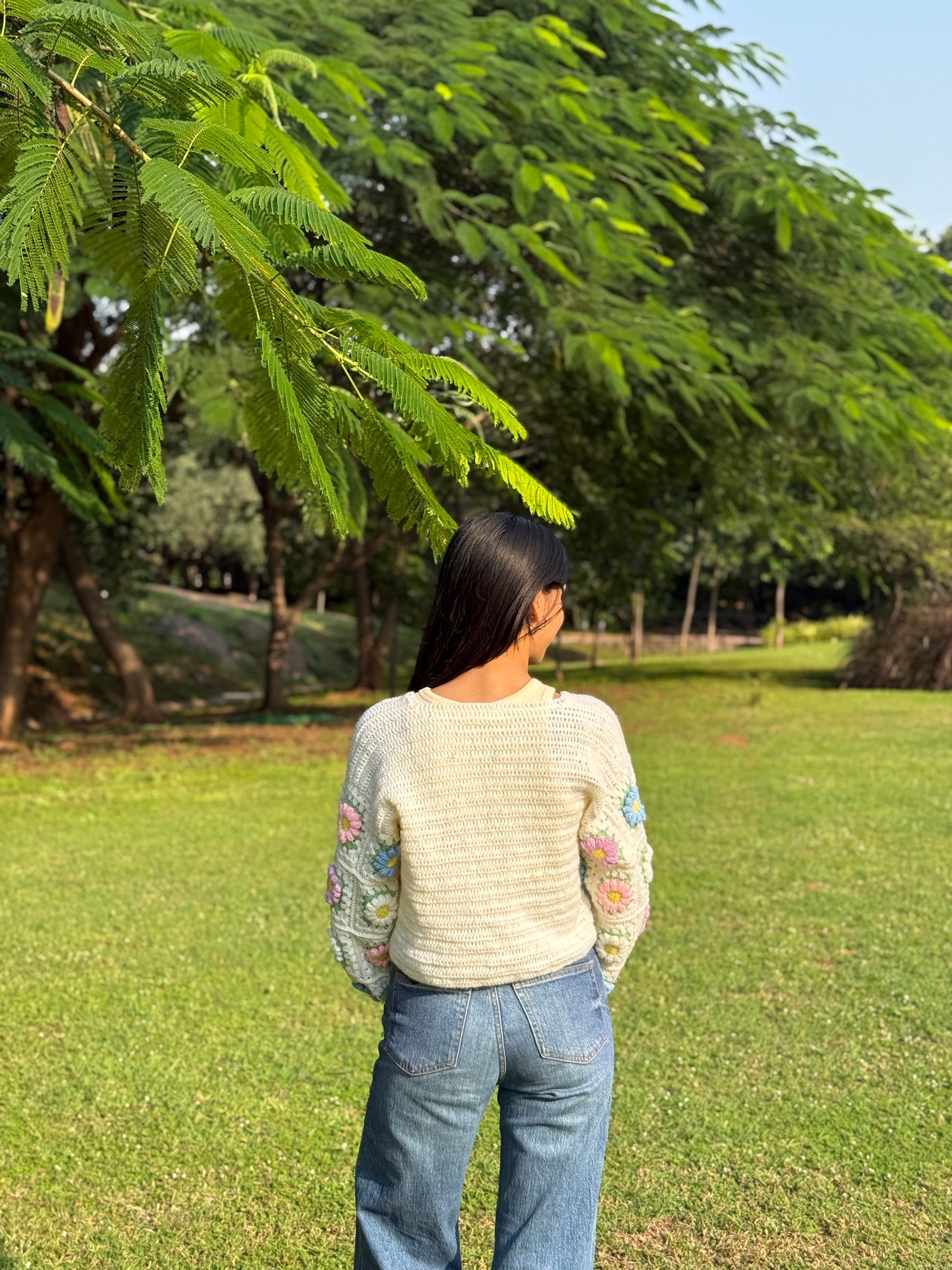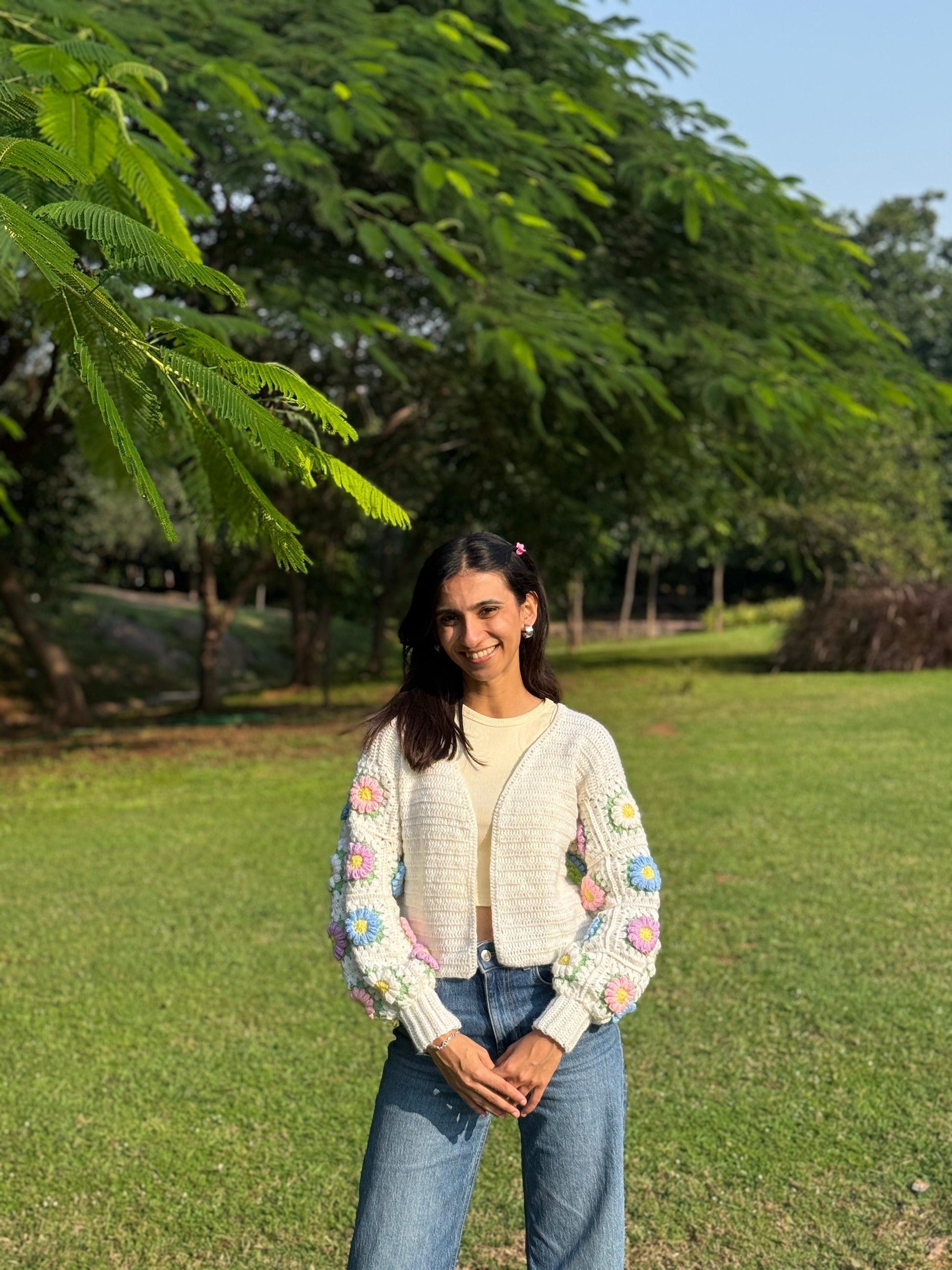 Handmade with love, this off-white crochet cardigan is crafted from 100% premium acrylic yarn. Featuring delicate 3D daisy detailing on the sleeves in dreamy pastel shades, it’s the perfect blend of cozy and chic.