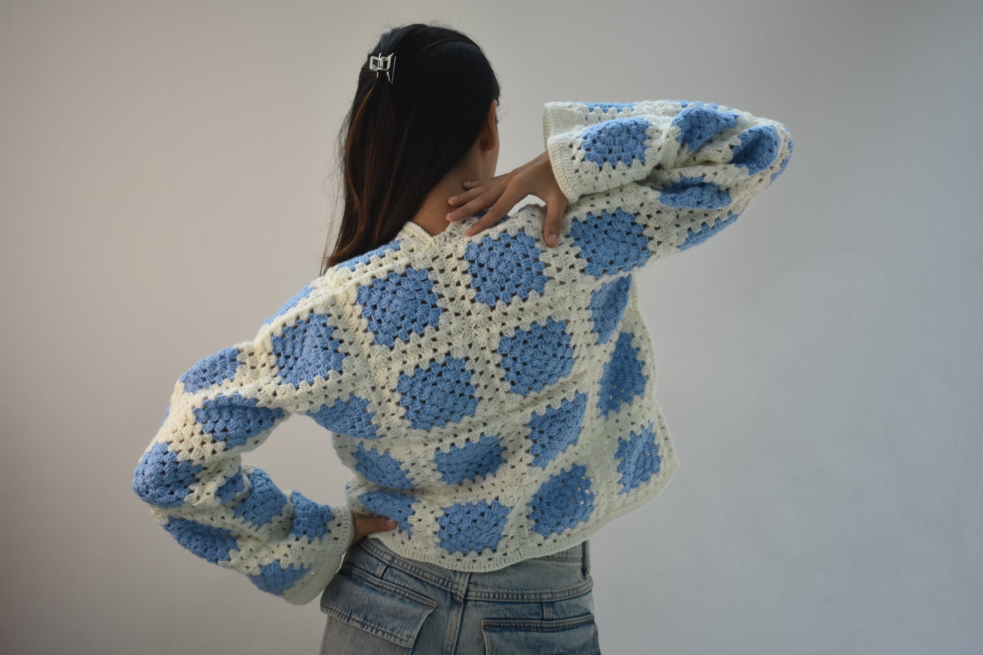 Wrap yourself in warmth with this handmade crochet cardigan. It's made with soft, 100% acrylic yarn and features a beautiful blend of off-white and blue granny square patches.