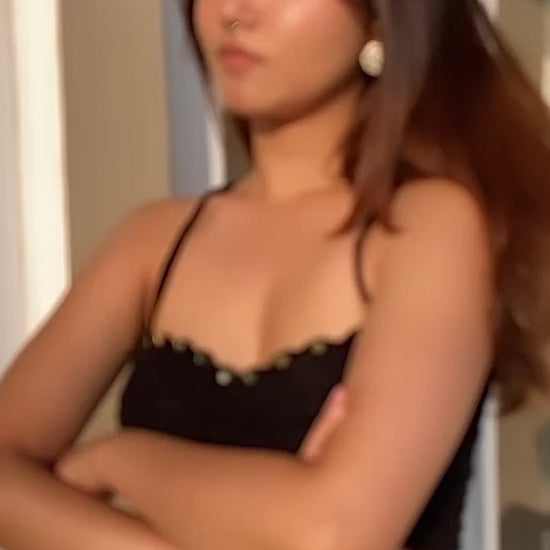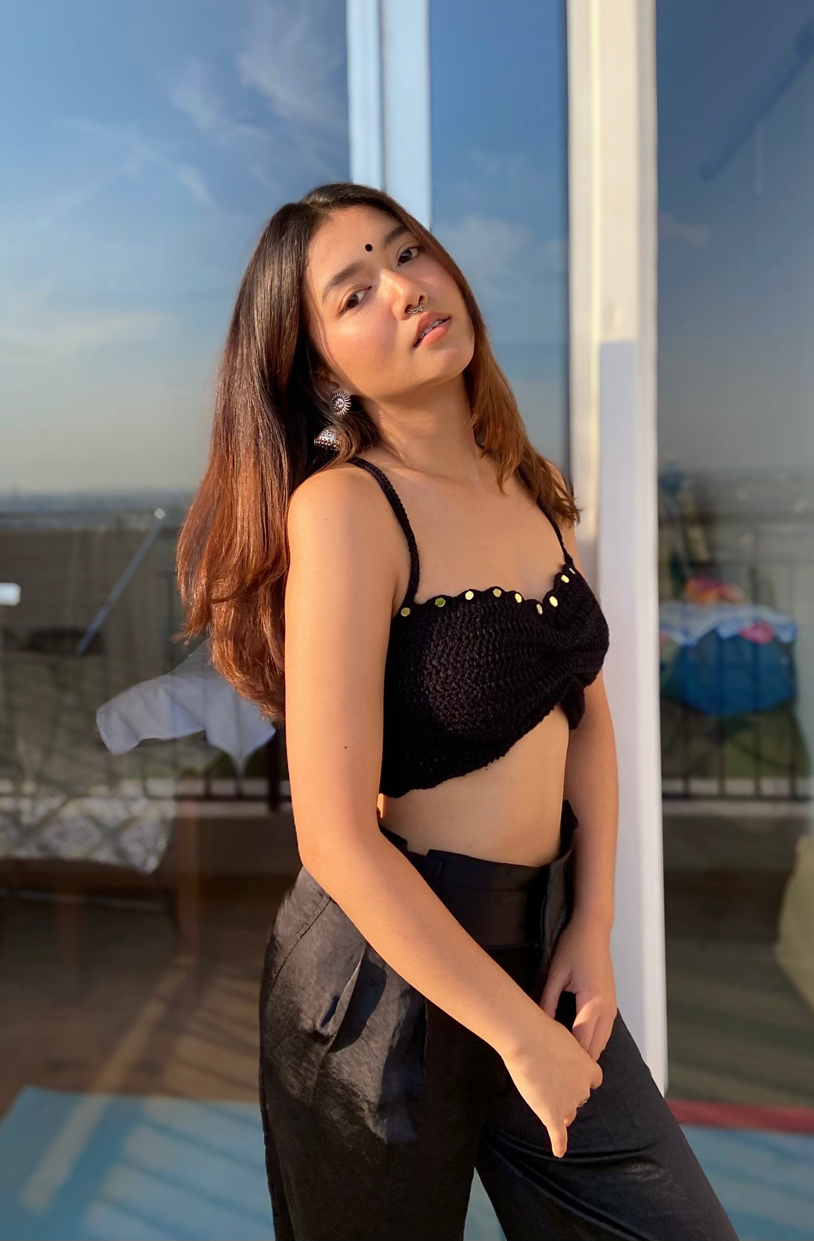Viola Crop top is hand-knitted with 100% premium acrylic yarn. Viola Top has a cultural tough with the mirrors at the neck line. A criss Cross adjustable back.